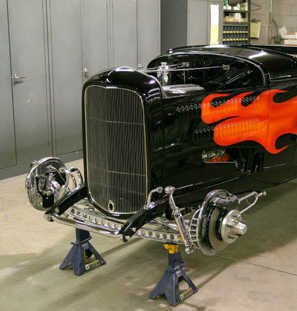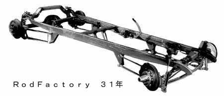 | 前ページでは「仮に注文するとして」と、書きましたが私は実際にもう注文しました! まず、お読みいただくまえに、これだけは注意してください。 私は、過去にフレームを注文したことがありませんので (ショップでもない限り、人生において戦前車のフレームを何度も注文すること自体ありえませんが(笑))、これが一番良い方法なのかどうか、わかりません。 実際にフレームが来たらひどいシロモノがくるかもしれませんし、すばらしいモノが来るかもしれません。 もしかしたら、お金だけ騙し取られるかもしれません。 これは賭けです。 これで大失敗したら、「こういう方法はダメなのね〜(笑)」と軽く流して笑ってください。 それによって何人かの人が私と同じ徹を踏まずに済むのであれば、それはそれで私のやったことには意味があるでしょう。 逆にうまくいけば、やりたいと思っていた方々に参考にして頂けるでしょう。 さて、それでは実際にフレームを注文するに当たって足回りのメニューを考えて行きたいと思います。 目指すスタイルにより、選択するパーツも当然違いますが、それらの話しを分かりやすくする為に、ざっくりと3タイプのスタイルを例にしたいと思います。 @多少、機能、性能に目をつぶっても当時のトラディショナルなスタイルを極めたい人。 A当時のスタイルを踏襲しながらも、安全性と機能もある程度両立させたい人。 B外見が戦前車でもとにかく現代車にも負けない速さ、性能、機能を極めたい人。 (注: ここでは、@にサビのキいた黒プライマーのワイルドな改造車は含まず) @とBは個々の部品の良し悪しはあれど、おのずとスタイルが決まってきます。 @に関しては50年以上の長いStreet Rodの歴史の中で培われたベンチマーク的なスタイルがあり、足回りはヘアピン・ラジアスロッド、エンジンもフラットヘッドなど部品の入手もメンテも大変で、今となっては本体価格も消耗品価格も高く、パワーを出すのが難しいといった、真性マニアの為のアイテムとなる為、私のような中途半端な軟弱Rodder野郎にはとても手がでせません(私、「踏む」ので馬力無い、壊れやすい、部品が高いエンジンはダメです・・・・笑)。 しかし、綺麗にディテーリングされたFヘッドを積んだトラディショナルな車両はホント〜にかっこいいです(ただし、速いのが条件)。 しかし、手間もコストも「恐ろしく」かかるし、なによりも経験とセンスが必要なので、作ってみたいとは思いますが、今回はおあづけ(笑)。