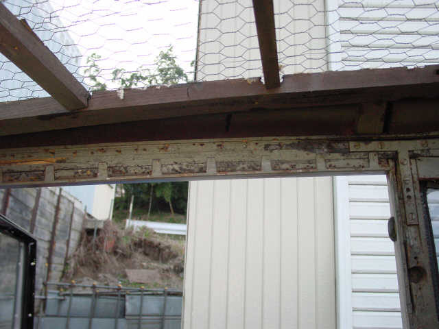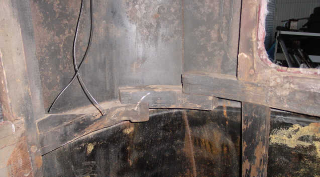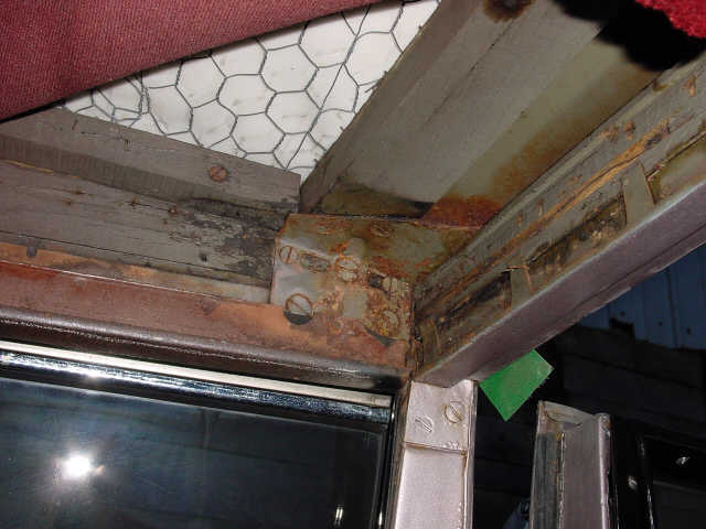 | しかし、天井をはがしてみると、さらに恐ろしいことが・・・・・フロントウィンドウの上、ドア上の構造材も全て木(驚)!! 上の画像は助手席側のAピラーです・・・・左右から交わる構造材が見事に木です。 |