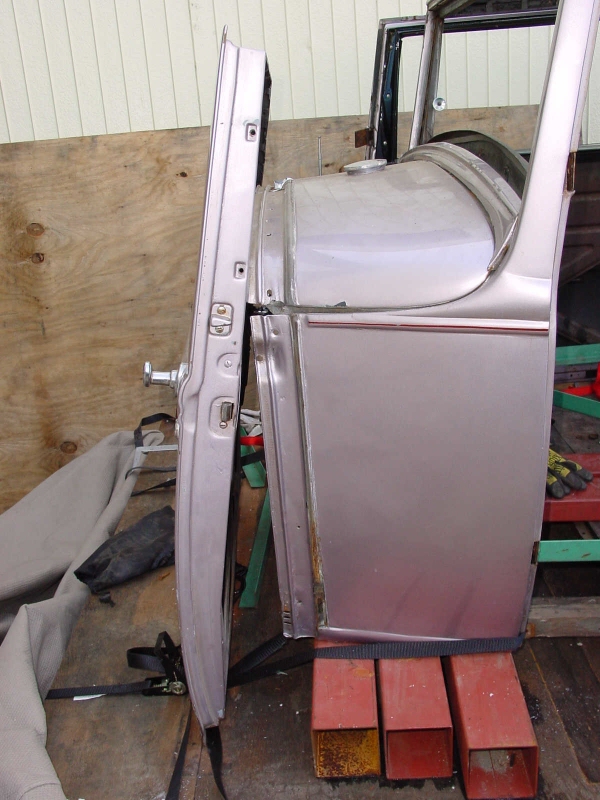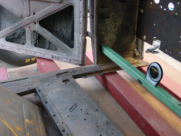 | ツッパリを入れて溶接する前にちょっと調整した箇所があります。 それはドアのチリです。 ボディ構造を決定している木材が縮んだと見られ、ドアの下方向のチリがキツクなっていましたのでタイダウンのベルトで引っ張り若干矯正しておきました。 ドアは内側のフレームの大部分を入れ替えるまでは正確なチリの状態で点付けでボディに溶接してしまいます。 具体的には5ミリ厚の鉄板を隙間にスペーサーとして挟みそれをボディとドアの両方がづれないように点付けしました。 | |