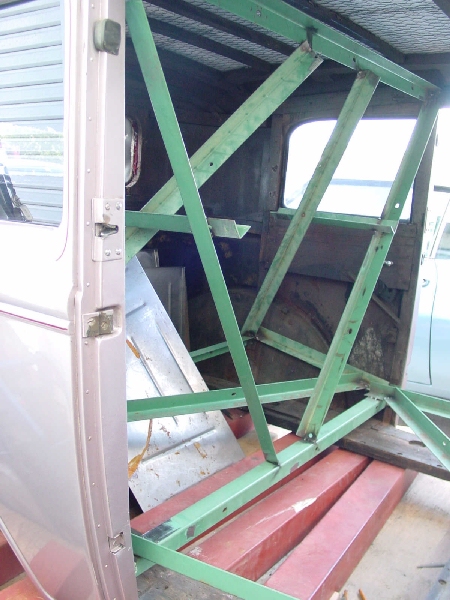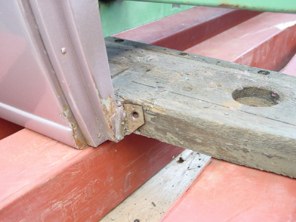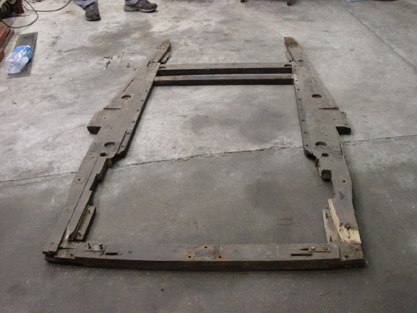 | レストア開始にあたって、まずは車体の検証を行いますが、車体がバラバラにならないようにツッパリを入れながら、すこしづつ慎重にばらして行きます。 このツッパリは木製フレームの要所要所にある鉄製のジョイント(エーモンのステーの厚いやつみたいなのですが)部分にMIGで点付けしていきました。 木の床板をおびただしい数の釘を抜きながらはずしていくとメインとなる骨格が出てきました。 画像を数枚用意しましたので、70年前のオーク材をじっくり見てやって下さい(汗)。 | |