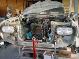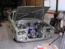 ボディレストア、および加工が終了し全剥離の塗装が終了したところ。エンジンは派手ににパープル。 |
