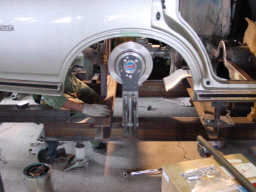 | 位置決め中のリアサブフレームとナロードしたフォード9のホーシング。 LSDを仕込み、リアは当然ドラムからディスクブレーキへ変更。 | |