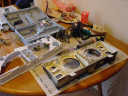 | メーターを極力純正の形を残してデジタル化することにした。まずは純正のアナログメーターをすべて取り去り、ダコタデジタルのメーターユニットの入るスペースをリューターで削って作る。 | |