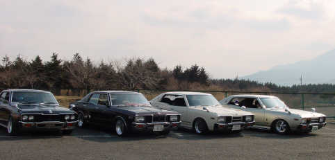 2003年3月21日、イ旧会5つのHp合同開催による、西部集会にて他の330の改造車と記念撮影。 クレーガーの「14インチ」 8J&10Jは、多分日本にこの1セットだけ!? |